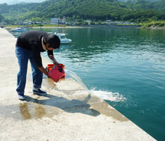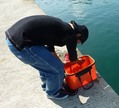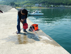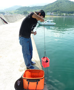 さて釣り場の清掃です!水汲みバケツで海水をせっせと汲み上げます。