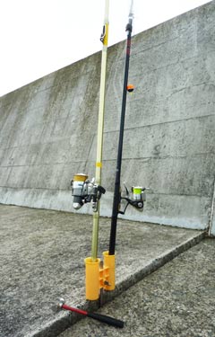 堤防や岩場の隙間に、この竿立てを固定します。