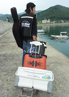 波止場での釣りの際は、このようにキャリーカートがあると便利!Turi@Naviのロゴが入ったライフジャケットを身にまとい、Uさんは颯爽とポイントへ向かっていきました!